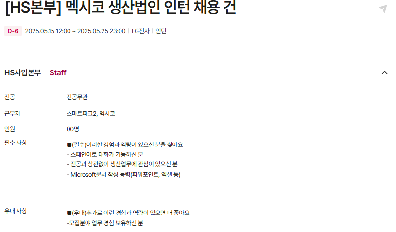 [HS본부] 멕시코 생산법인 인턴 채용 건 (세탁기법인)