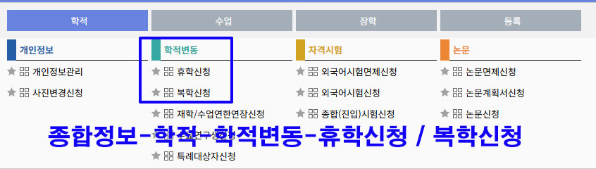 - 일반 휴·복학 온라인 신청방법: 학생종합정보시스템(https://p.chosun.ac.kr) - 대학원생 - 학적 - 휴학신청 또는 복학신청