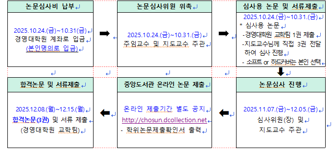 • 제출기간: 2025. 12. 08.(월) ~ 2025. 12. 15.(월) 1. 학위신청논문 심사결과표(서식7) 1부. 2. 학위신청논문 심사요지서(서식8) 1부. 3. 구술시험 결과 보고서(서식9) 1부. 4. 논문제목 변경 승인 제청서(서식10) 1부. ※ 심사중 논문제목 변경 즉시 제출 5. 외부 심사위원승낙서(해당자에 한함)(서식11) 1부. 6. 학위논문제출확인서(중앙도서관 dcollection에 접속) 1부. - 중앙도서관 dcollection 접속: http://chosun.dcollection.net - 논문 온라인 제출 등록 후 등록확인서 출력 |