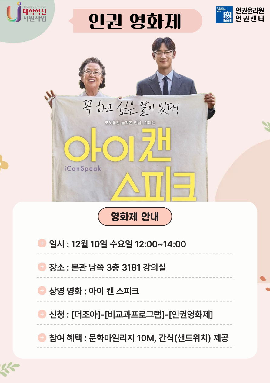 ㅁ 신청방법: 조선대학교 THE조아시스템 → 비교과 → 비교과 신청 → 프로그램 검색 → '인권영화제'