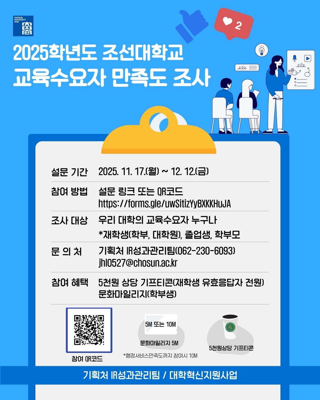 2025학년도 조선대학교 교육수요자 만족도 조사를 다음과 같이 실시하오니 많은 관심과 참여 바랍니다.