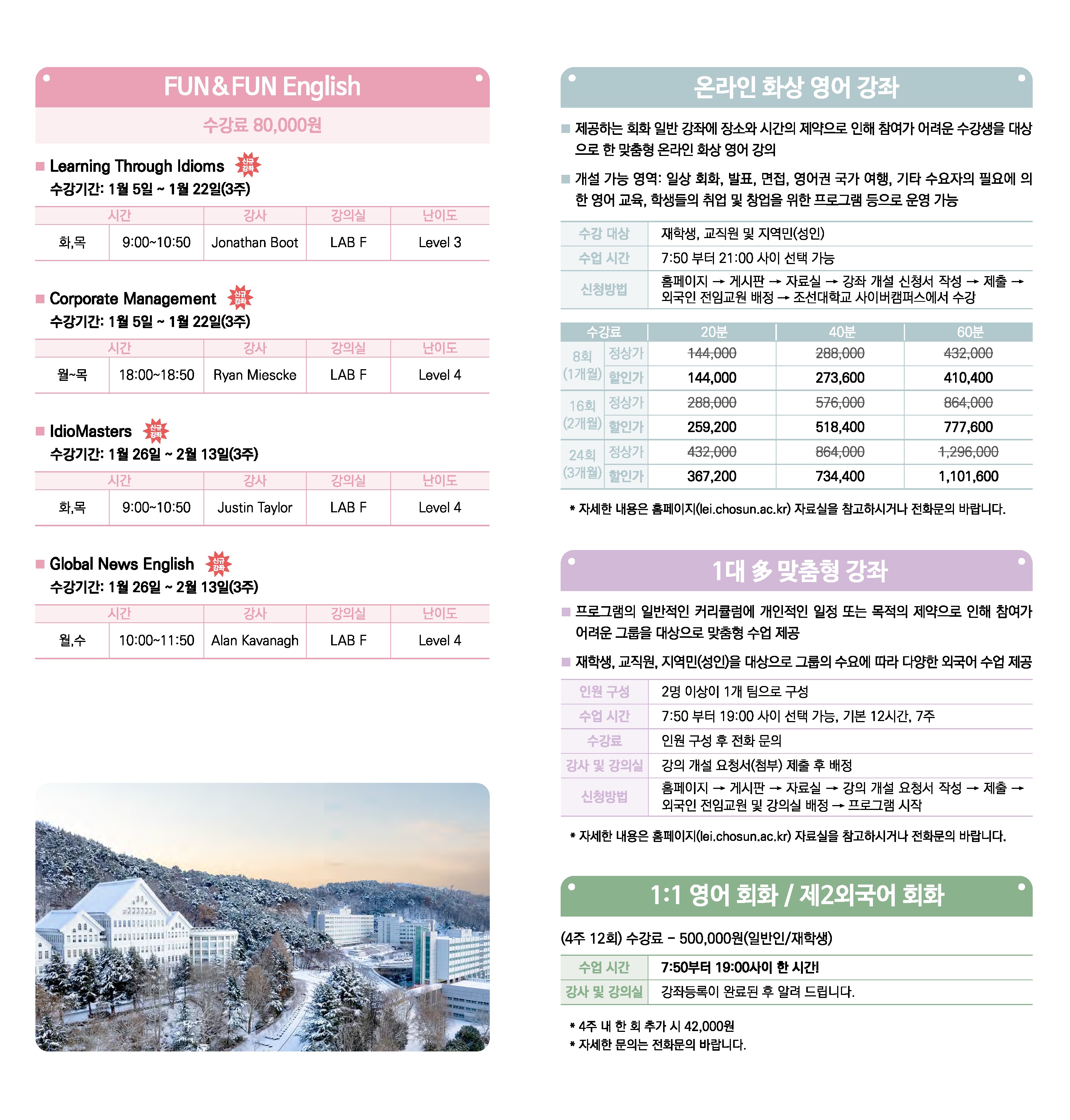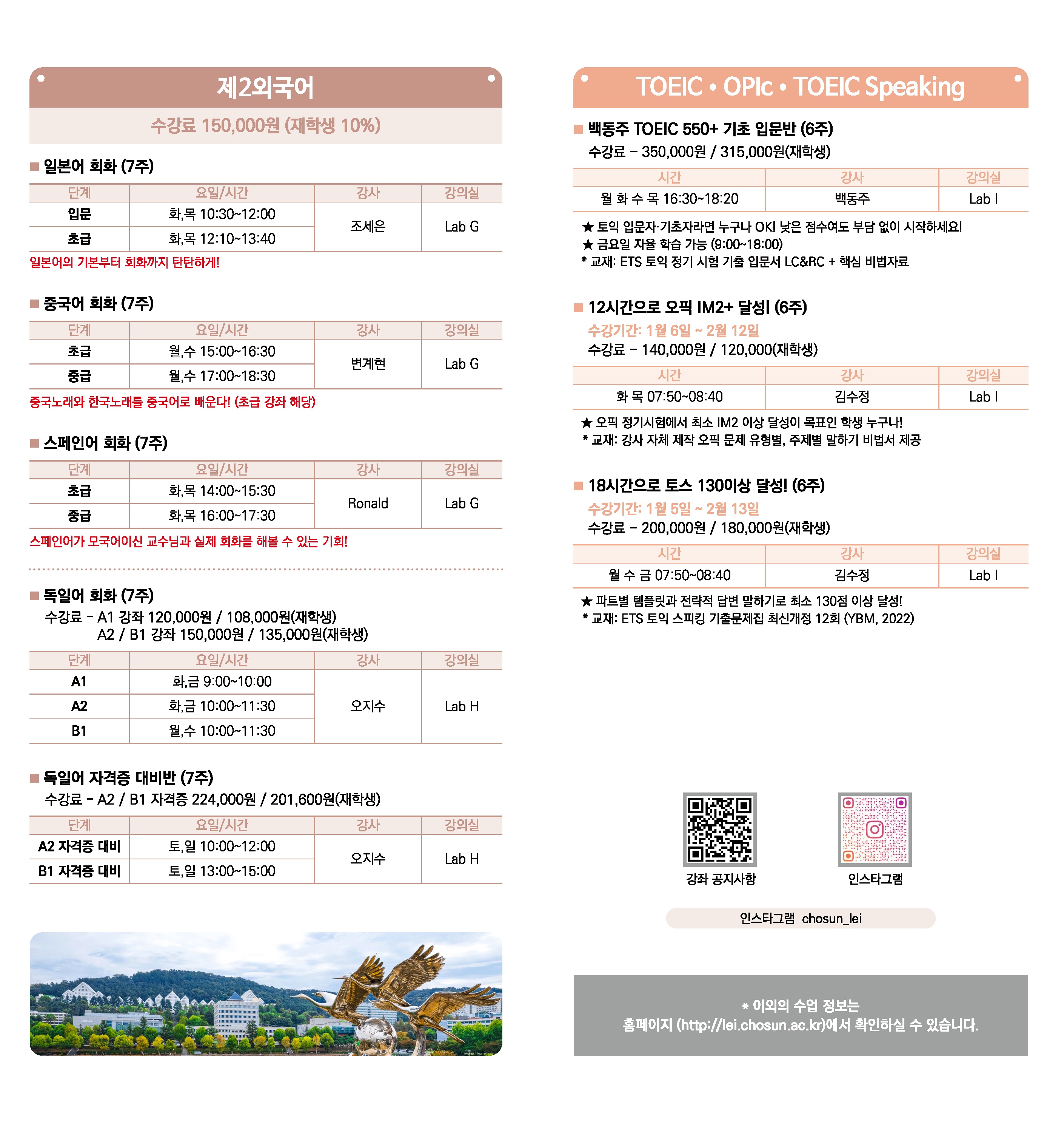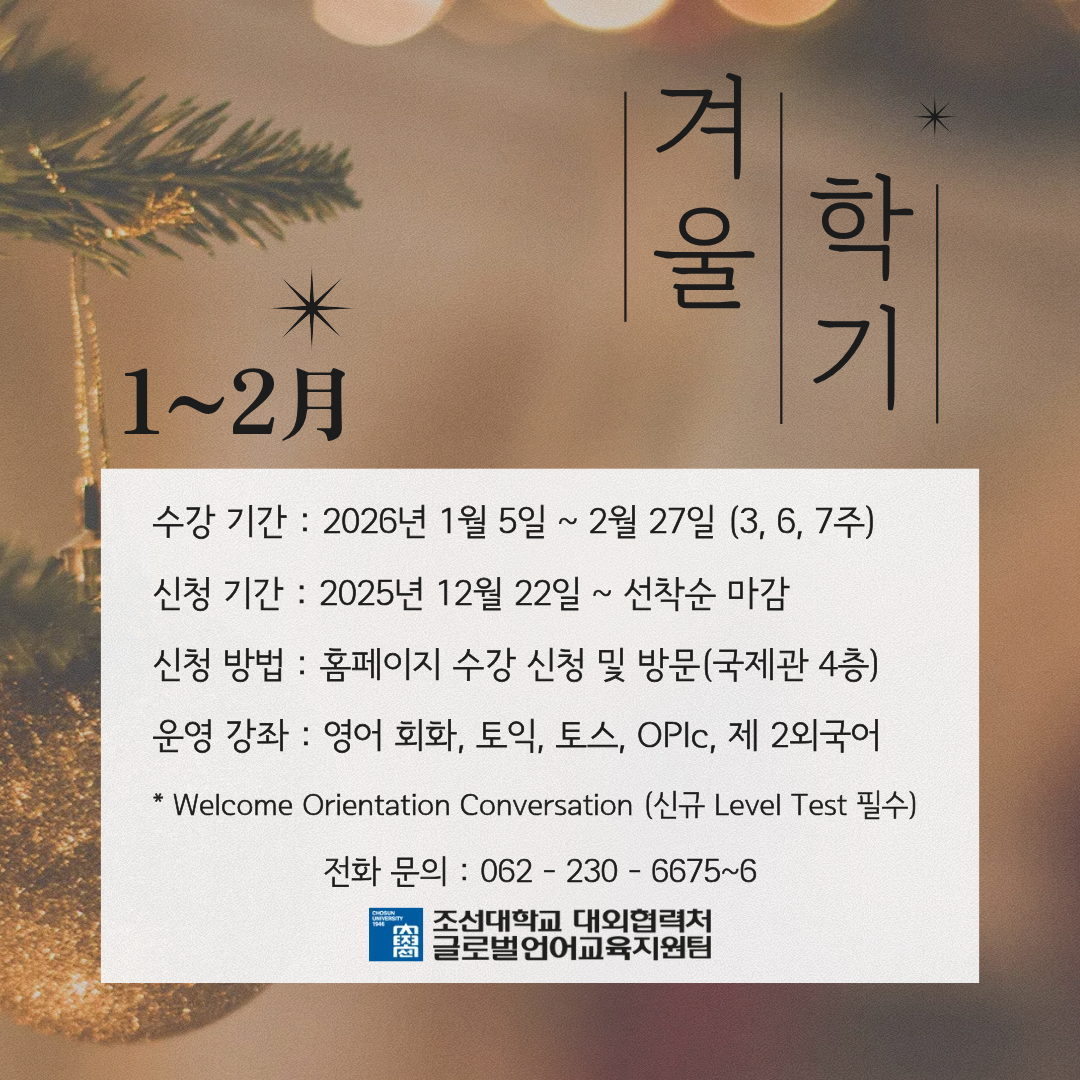 25학년도 겨울학기 외국어 강좌 개강(12월 22일 선착순 접수+Level Test 일정 안내)