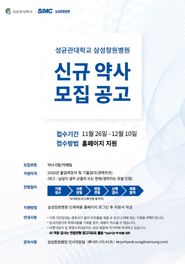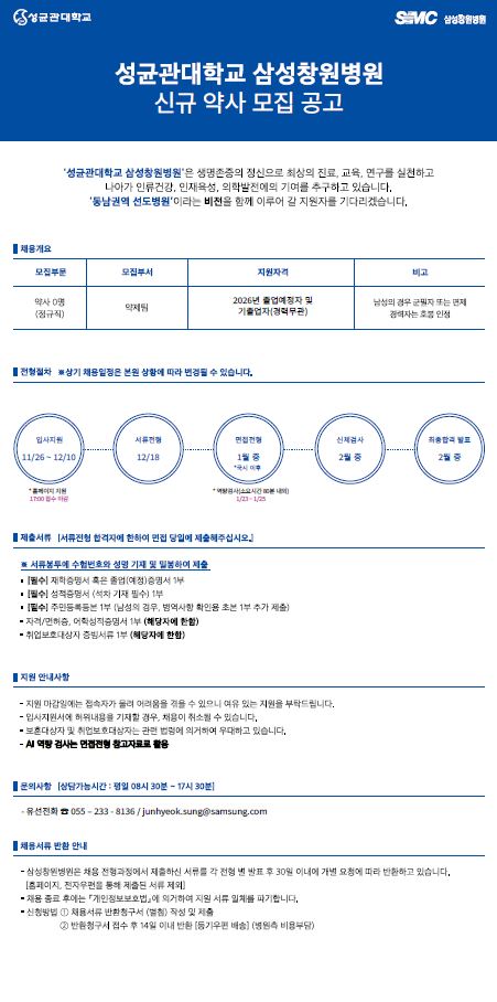 2026년도 성균관대학교 삼성창원병원 신규 약사 모집 공고