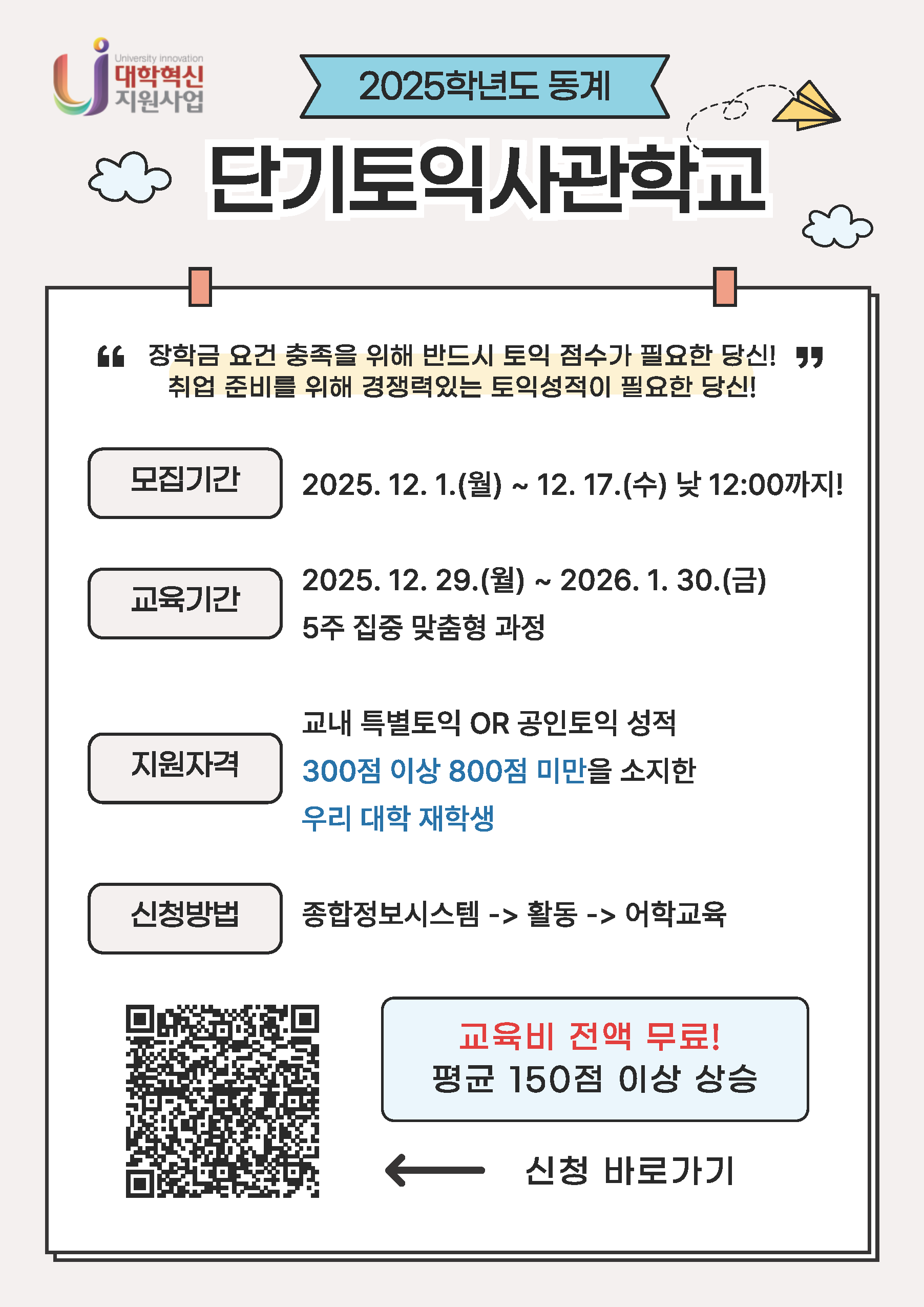 fnctId=bbs,fnctNo=257 글번호 228410 [글로벌언어교육지원팀] 2025학년도 동계 단기토익사관학교 안내 작성일 2025.12.12 수정일 2025.12.12 작성자 법사회대학관리자 조회수 23 첨부파일 첨부파일이(가) 없습니다.